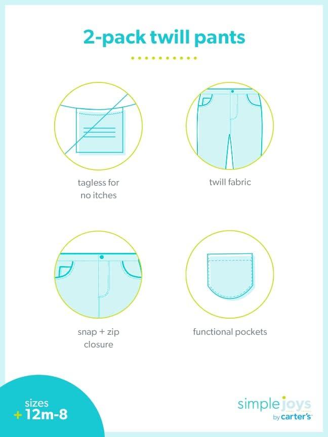 These versatile twill pants from Simple Joys by Carters come in a convenient two-pack, offering great style and comfort for your little one. Designed in two classic colors, they pair effortlessly with any outfit, whether for school days or weekend outings. Made with durability in mind, these pants stand up to playtime and everyday wear, while maintaining a soft feel for all-day comfort. A perfect choice for parents who want dependable, budget-friendly options without compromising on style or function.