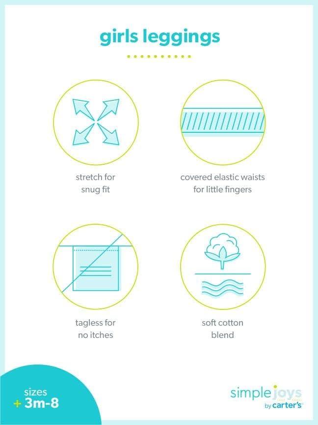 The Simple Joys by Carter's 3-Pack of Leggings for girls is the perfect blend of comfort, style, and practicality. Designed with active little ones in mind, these leggings come in a variety of vibrant prints and colors that will add a playful touch to any outfit. Each pack includes three pairs of leggings, each with its own unique design to suit different moods and occasions. Crafted for all-day wear, these leggings feature a soft, stretchy fabric that provides a comfortable fit and allows for plenty of movement. The elastic waistband ensures a snug but flexible fit, making them ideal for running, jumping, and playing. Easy to care for and durable, these leggings are designed to withstand frequent washing while retaining their color and softness.