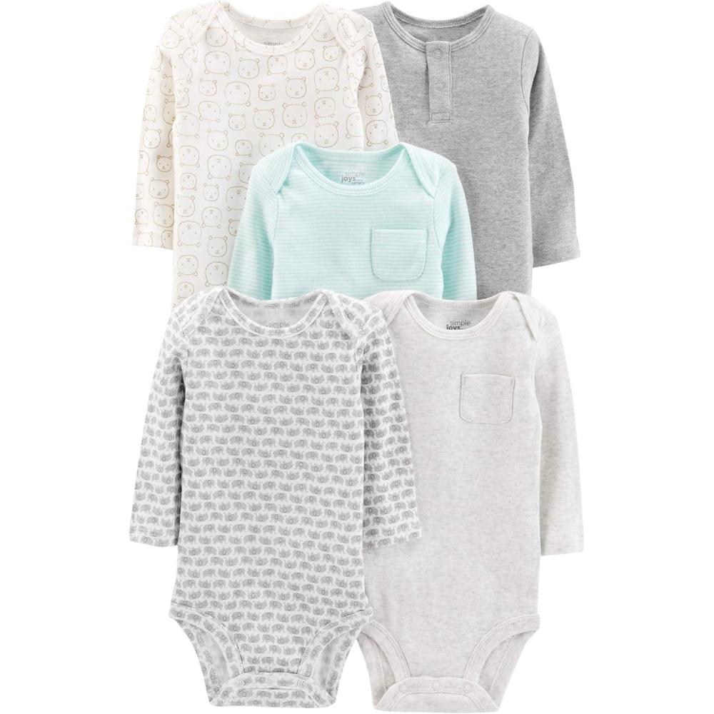 imageSimple Joys by Carters Unisex Baby 5pack Longsleeve BodysuitAqua Blue StripeGrey HeatherWhite HeatherBearElephants